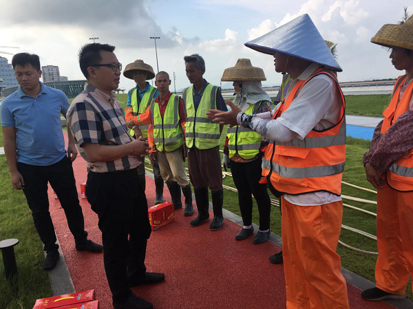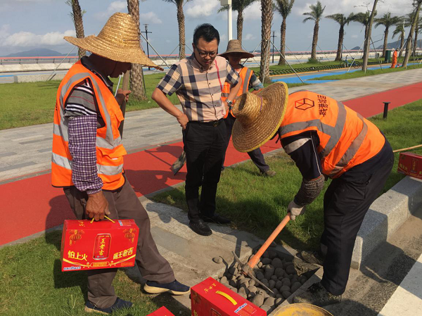 慰問(wèn)組一行先后來(lái)到金山公園、金灣路,分別慰問(wèn)園林綠化、市政道路管養(yǎng)、水利等一線作業(yè)員工。“你們辛苦了,感謝你們?yōu)槲拿鞒鞘懈冻龅男燎诤顾团Α保u湘斌董事長(zhǎng)對(duì)他們?yōu)榫S護(hù)城市環(huán)境衛(wèi)生作出的努力表示感謝,進(jìn)一步了解了員工的工作情況及困難,并再次叮囑他們在烈日和高溫下作業(yè)要采取有效防暑降溫和安全生產(chǎn)保障措施,以健康的身體和愉悅的心情投入到工作中。